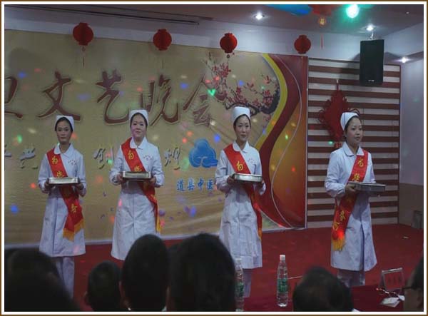 熊晓峰院长首先致辞,希望全院员工带着对新年的美好憧憬,踏上新的征程,并衷心祝愿全体员工节日快乐!祝愿中医院的明天更美好!晚会节目内容丰富多彩,有宏扬医院正能量的《天使在人间—礼仪风采展示》、《相亲相爱》、《我心中的故事》;也有妙趣横生的小品《傻子上学》、《新白娘子传奇》、《甄嬛传》、《我们约会吧》;有大型舞蹈《骑马舞》、《玫瑰佳人》、《茶山情歌》、《两个人》;也有独唱、大合唱、歌伴舞、诗朗诵、朗诵伴舞、电钢琴独奏、太极拳、魔术等等,可谓百花争艳。本次文艺晚会,不论是小品、歌舞还是礼仪风采展示、诗朗诵等,都给观众带来了一幕幕华彩的视觉盛宴。有的动感十足,朝气蓬勃;有的温婉妩媚,婀娜多姿;抑或是如火般炙热劲爆,都使观众陶醉在这美妙的音符之中。整个晚会充满了温馨与快乐,让人充满激情、活力四射。