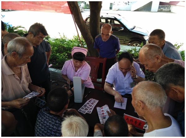 在审章塘乡政府操场上,前来寻医问药的瑶族乡亲们络绎不绝,中医院义诊服务队的医护人员认真细心地接待着每一位乡亲。对前来咨询健康的村民给予耐心而细致的解答;向他们宣传中医保健知识和解答有关医学方面的问题;并给予了健康指导;对身患疾病的乡亲们进行诊疗并免费发放治疗药品。