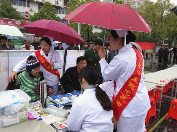 广场上,站满了前来参加活动的群众。在各单位的展台前,人们不仅咨询着怎样辨别各类真假商品,还咨询着中医健康养生,在道县中医院义诊咨询台前,更是站满了前来咨询健康和测量血压的市民,中医院的医生和学雷锋志愿者打着雨伞热情地为市民健康服务着,据悉,测量血压和咨询服务近200人,发放活动宣传资料100多份。