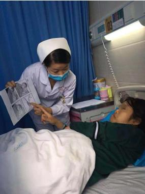 护士运用图片和手势向产妇普及新生儿喂养知识以及注意事项
