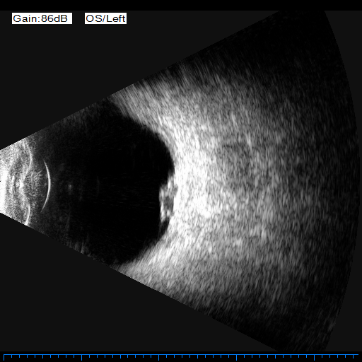 眼科特检师胡燕娟护士给患儿进行了相关检查,发现患儿眼前段照相有双眼颞上颞下球结膜下出血;眼底照相显示:患儿右眼眼底静脉血管末端出血,左眼眼底可见黄斑区有一黄白黑相间的肿块,合并视网膜脱离、视网膜下积血;双眼球B超示患儿左眼视网膜下积血,左眼视网膜脱离,疑是左眼脉络恶性色素瘤?
